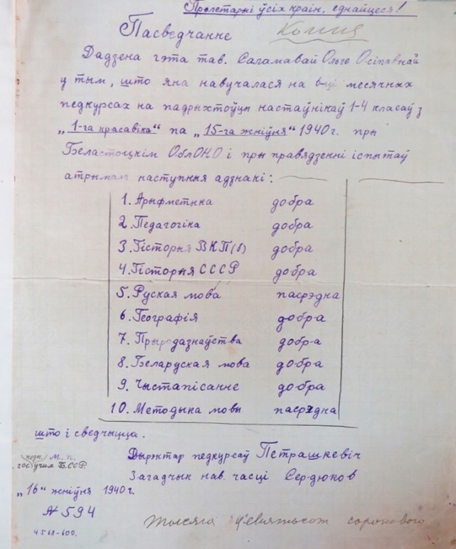 Приказом по Гродненскому Районному Отделу Народного образования назначена учительницей начальной школы в деревню с 20 августа 1940 года.
