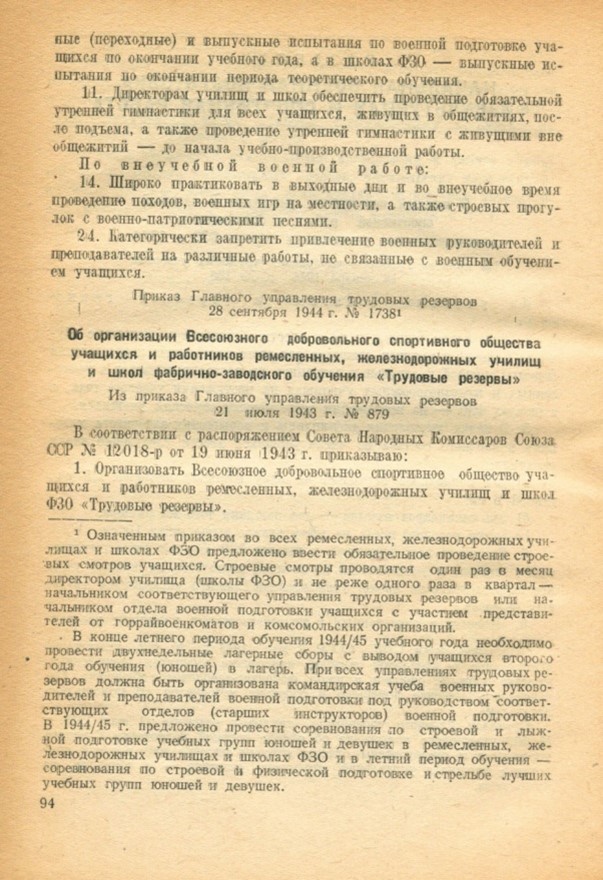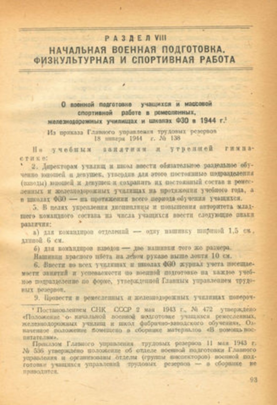 О военной подготовке учащихся и массовой спортивной работе в ремесленных, железнодорожных училищах и школах ФЗО в 1944 г. Из приказа Главного управления трудовых резервов. 18 января 1944 г. № 138 |