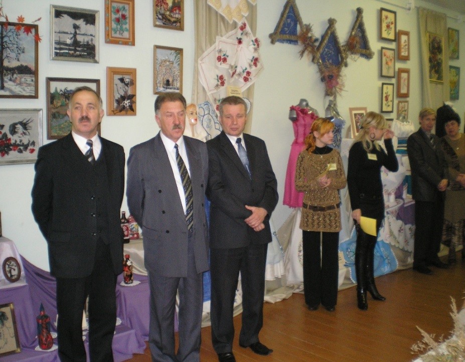 На фото: Александр Николаевич с Анатолием Ивановичем Носко, директором Гродненского колледжа приборостроения, и Антоном Степановичем Гаврицким, директором Гродненского областного Дома технического и художественного творчества учащейся молодежи, на выставке декоративно-прикладного творчества ПТО области |
