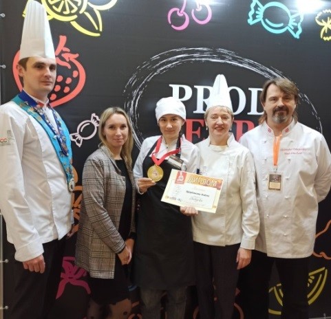На фото: мастер производственного обучения Щука Ольга Викторовна и ее учащаяся Щербакова Алёна, ставшая обладательницей Золотой медали в номинации "Закуски" на международной специализированной выставке-ярмарке «Продэкспо». |