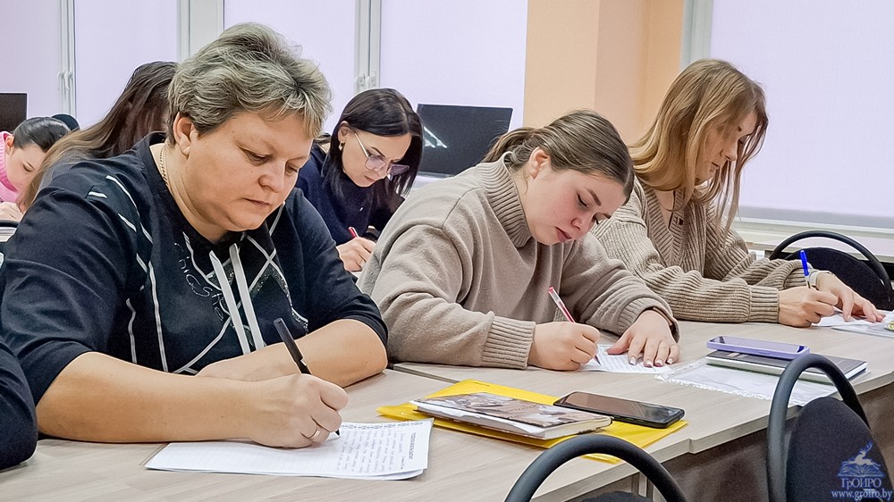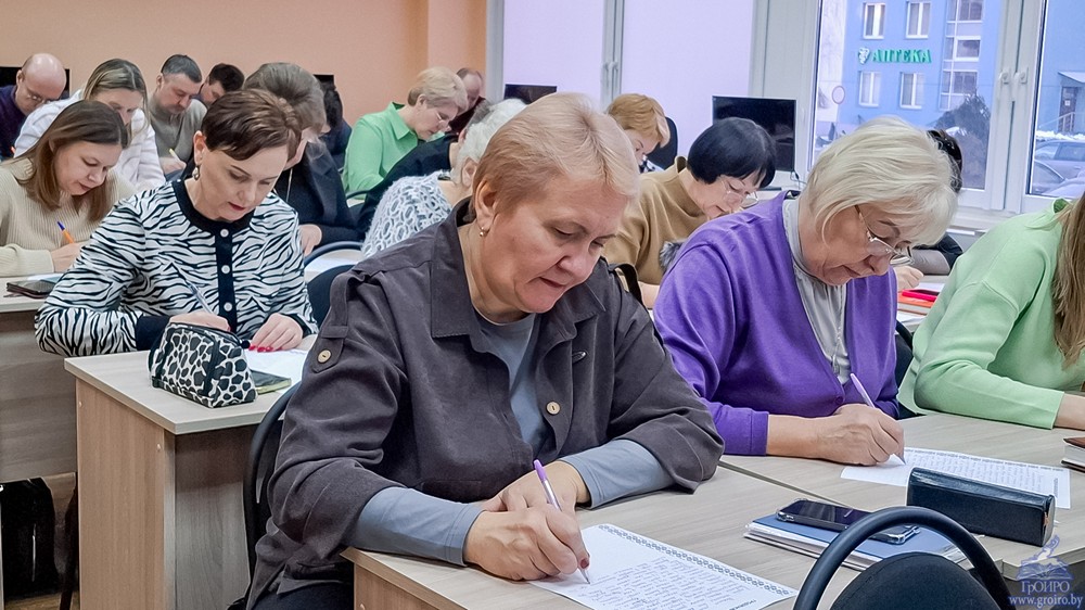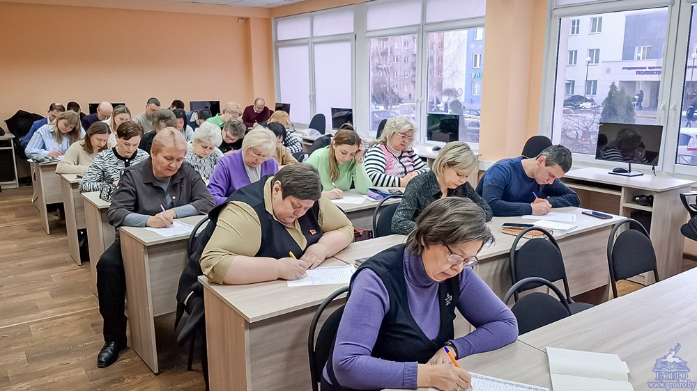 Потым супрацоўнікі інстытута, слухачы павышэння кваліфікацыі далучыліся да напісання Гродзенскага абласнога дыктанта. У гэтым годзе тэкст дыктанта прысвечаны 80-годдзю Перамогі ў Вялікай Айчыннай вайне. У аснову пакладзены ўспаміны Барыса Сачанкі пра сваё маленства.