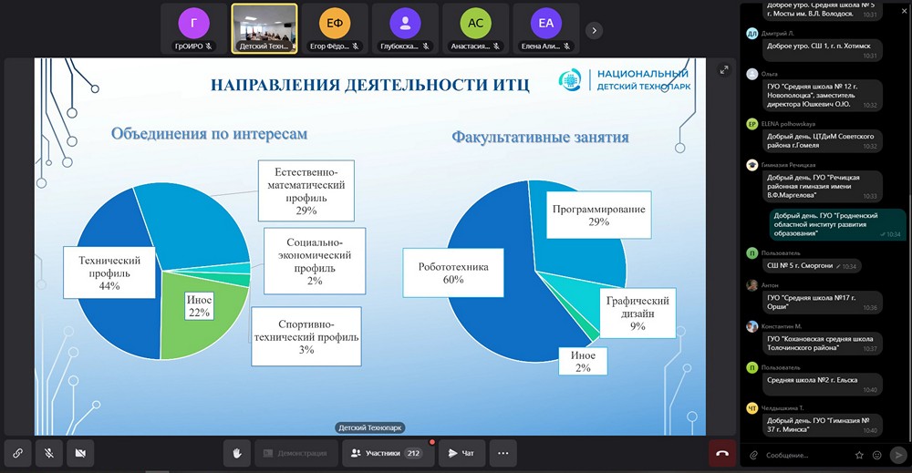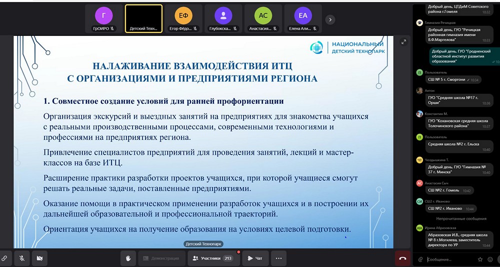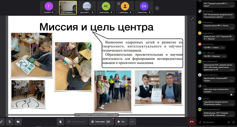 К видеосовещанию присоединился заместитель начальника методического управления информационных технологий и технических средств обучения ГрИОРО – Артур Адамович. Областной институт развития образования занимается курированием инженерно-технических центров Гродненской области. Наработки региона в этом направлении в рамках заседании представили педагоги ГУО «Гимназия №1 имени Ф. М. Синичкина г. Слонима», а также ГУО «Средняя школа №11 г. Ошмяны имени М. М. Гружевского».