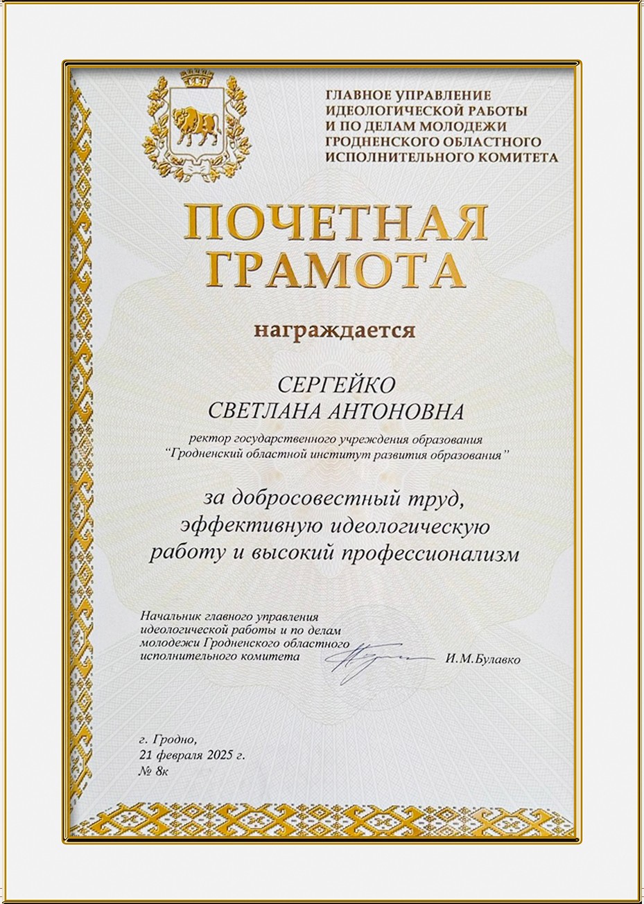 РЕКТОР ГРОИРО, СВЕТЛАНА СЕРГЕЙКО, УДОСТОЕНА ПОЧЁТНОЙ ГРАМОТЫ ГЛАВНОГО УПРАВЛЕНИЯ ИДЕОЛОГИЧЕСКОЙ РАБОТЫ И ПО ДЕЛАМ МОЛОДЁЖИ ГРОДНЕНСКОГО ОБЛИСПОЛКОМА