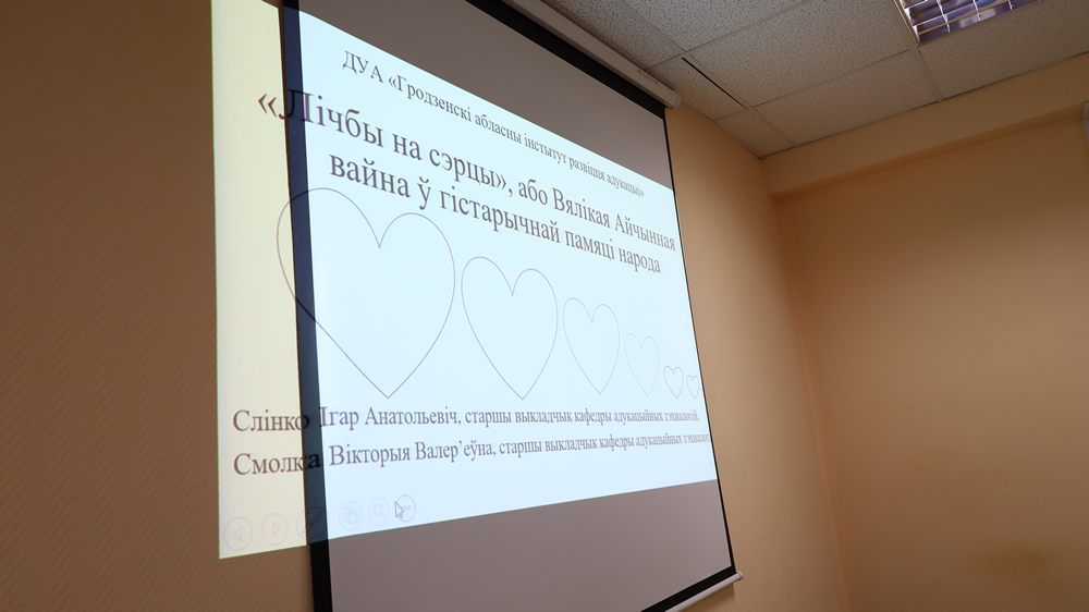 На бягучым тыднi старшыя выкладчыкi кафедры адукацыйных тэхналогiй Слiнко Iгар Анатольевiч i Смолка Вiкторыя Валер'еўна прадоўжылі рэалізоўваць сумесна распачаты творчы праект – заняткі ў форме круглага стала пад назвай «Лiчбы на сэрцы». Слухачам курсаў павышэння кваліфікацыі розных груп і катэгорый былі прапанаваны цікавыя і падчас нечаканыя факты з ваеннай гісторыі беларускага мастацтва і культуры. Як перад лектарамі, так і перад усімі ўдзельнікамі дыскусіі была пастаўлена адзіная мэта, а менавіта: здзейснiць культурна-гiстарычны экскурс у ваеннае мiнулае і ў творчым суладдзi падзялiцца педагагiчным вопытам выхаваўчай працы з моладдзю, намацаць найбольш паспяховыя шляхi фармавання духоўнасці і патрыятызму ў вучнёўскiм асяродку.