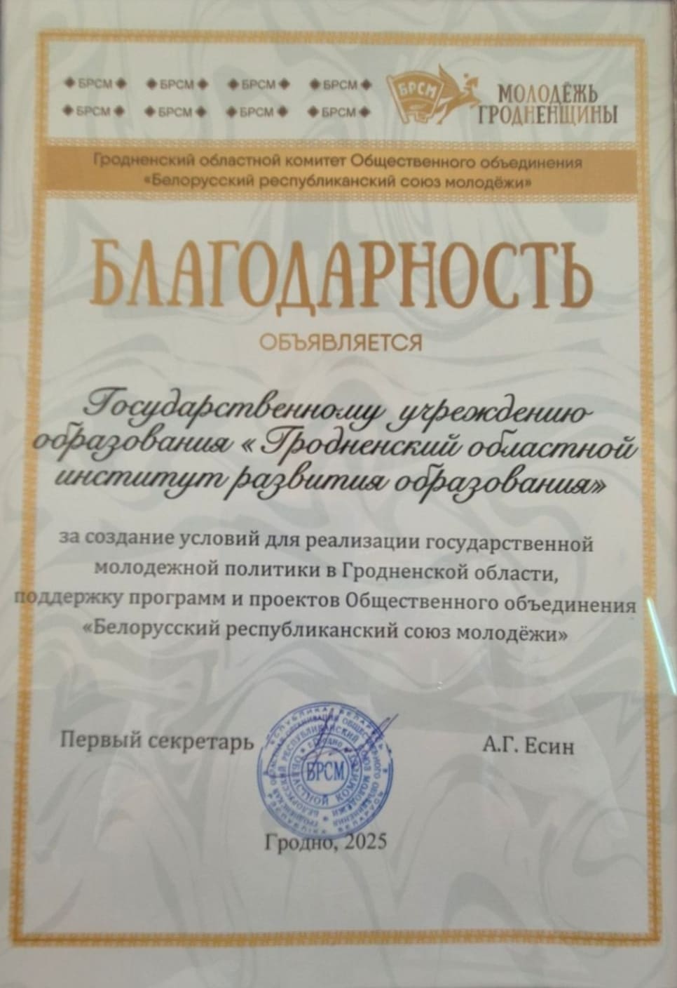 Благодарность за создание условий для реализации государственной молодежной политики в Гродненской области, поддержку программ и проектов Общественного объединения «БРСМ» по праву была вручена ректору Светлане Антоновне Сергейко.
