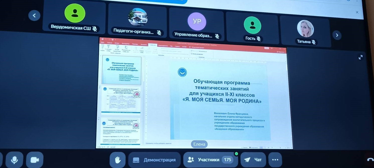 На вебинаре выступила Михалевич Елена Францевна, начальник отдела методического сопровождения воспитательного процесса в учреждениях образования центра социальной, воспитательной и идеологической работы ГУО «Академия образования», которая остановилась на основных вопросах программно-методического сопровождение обучающей программы тематических занятий для учащихся II-XI классов «Я. Моя семья. Моя Родина» в 2025/2026 учебном году.