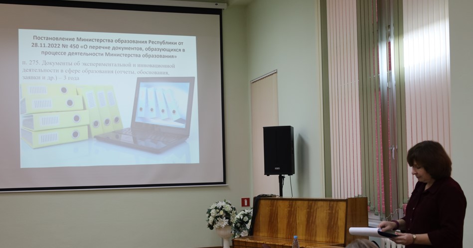 Марина Ивановна подробно остановилась на организационных аспектах управления инновационной педагогической деятельностью, на особенностях методической работы в условиях инновационного развития учреждения образования, а также ключевых аспектах формирования команды для реализации организационных изменений. Особое внимание на семинаре было уделено документальному сопровождению экспериментальной и инновационной деятельности.