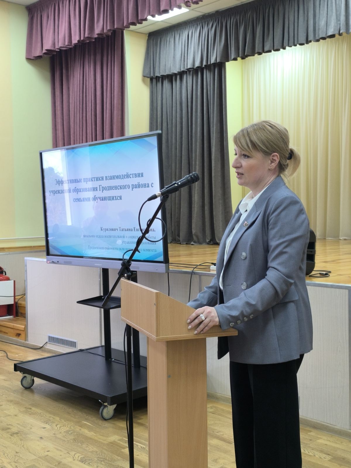 В рамках работы семинара-практикума была представлена система работы учреждений образования Гродненского района с семьями обучающихся, организована работа интерактивных площадок: семейный клуб «Дружба»: развитие воспитательного потенциала семьи, клуб отцов «Мудрый папа»: искусство быть родителями, клуб молодых родителей «Радость познания»: первые шаги в воспитании и обучении детей вместе, родительские уроки «Мир профессий», грани сотрудничества семьи и школы: родительский комитет классного коллектива.