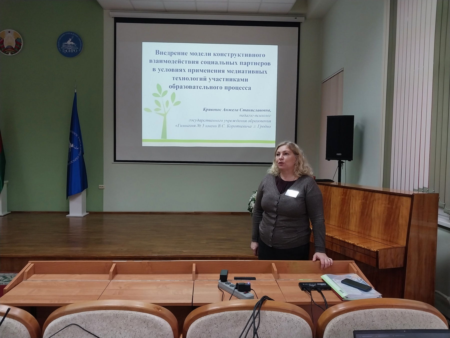 Анжела Станиславовна Кривонос, педагог-психолог ГУО «Гимназия № 5 имени В.С.Короткевича г. Гродно» познакомила с опытом инновационной деятельности в области построения конструктивного взаимодействия с помощью медиативных технологий, которые являются готовыми инструментами для создания психологически безопасной и эффективной образовательной среды.