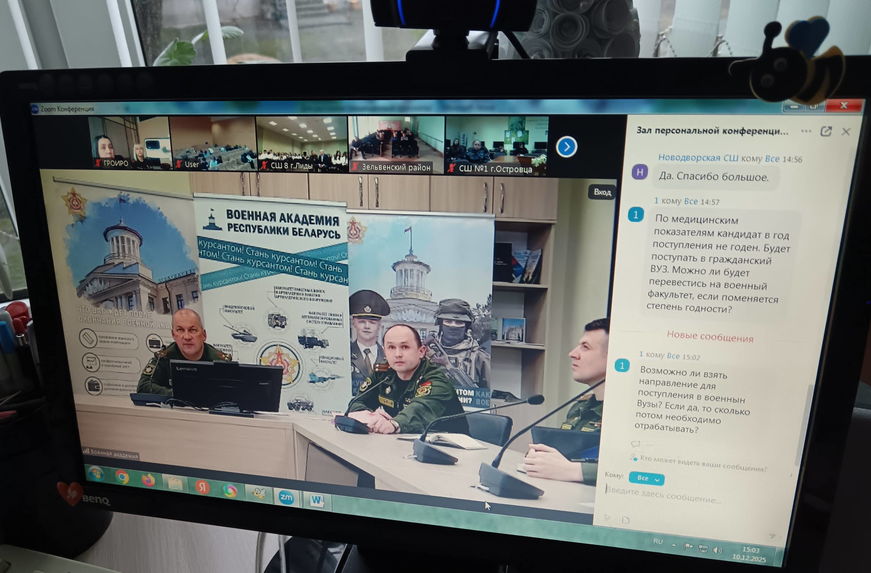10.12.202510 декабря 2025 года сотрудники центра воспитательной, идеологической, социально-педагогической работы института приняли участие в телемосте между учреждением образования «Военная академия Республики Беларусь» и учреждениями общего среднего образования, военными комиссариатами Гродненской области по вопросам информационной поддержки учащихся для осознанного выбора ими профессии защитника Отечества.