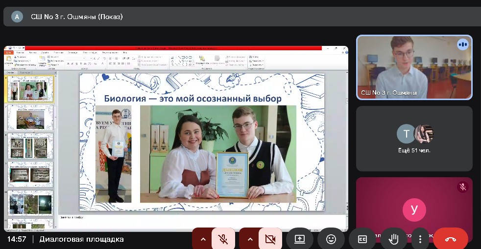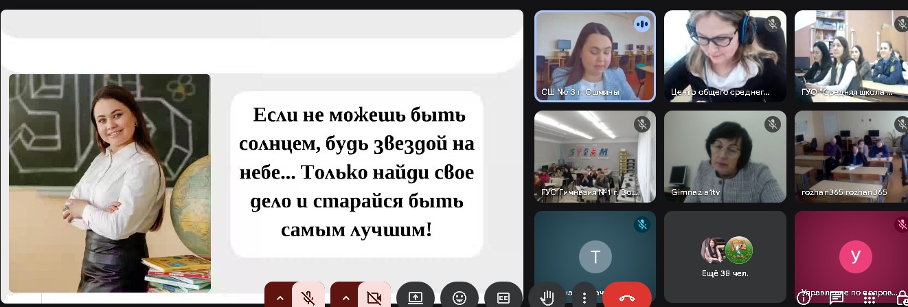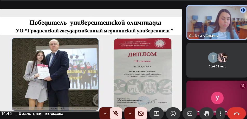 Диана Геннадьевна рассказала об эффективных методах вовлечения учащихся в предмет, разноплановой подготовке к республиканской олимпиаде, о классном руководстве, построении диалога с родителями и о важном месте семьи и близких в жизни каждого ребёнка. Успех этого подхода подтвердил Егор Сафоненко, ученик Дианы Геннадьевны и многократный призер олимпиад. Он на своем примере доказал, что при грамотном планировании можно успешно совмещать интеллектуальные конкурсы, спорт, музыку, ландшафтный дизайн и другие увлечения.