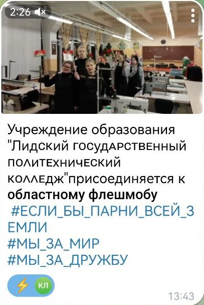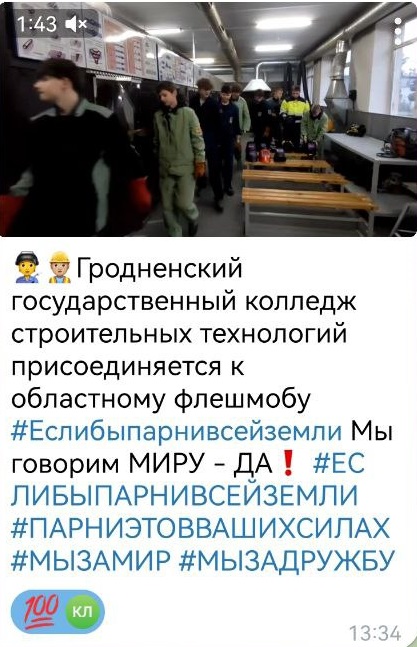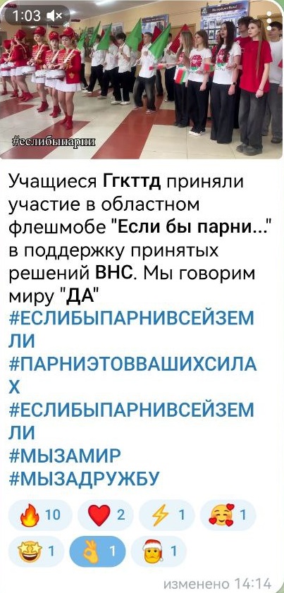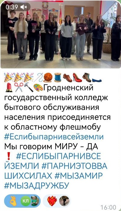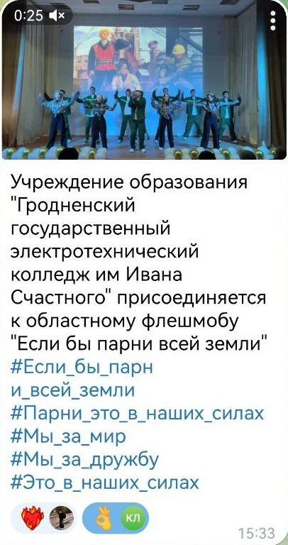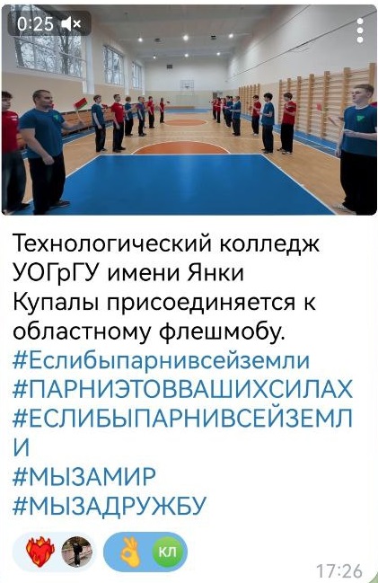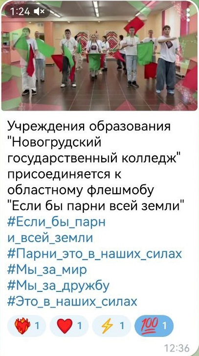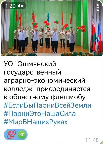 24.12.2025Члены Гродненского областного совета обучающихся колледжей инициировали проведение флешмоба «Если бы парни всей земли» в поддержку решений, принятых VII Всебелорусским народным собранием. Флешмоб стартовал 22 декабря.