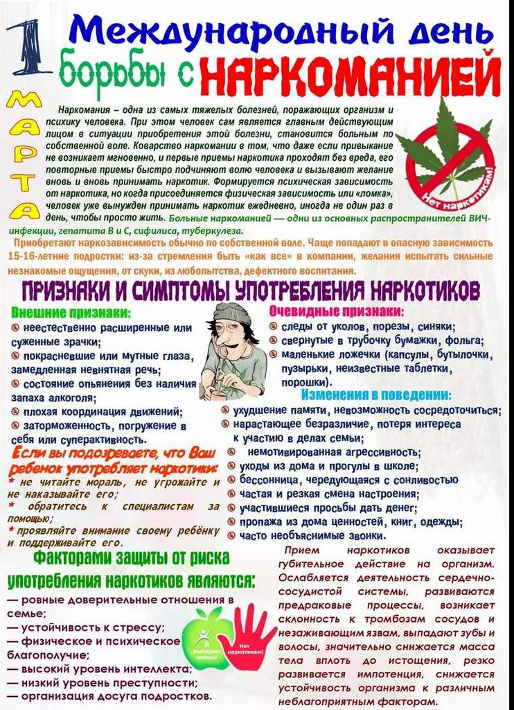 27.02.2026Ежегодно 1 марта во всем мире отмечают День борьбы с наркоманией. Данная проблема не теряет своей актуальности до сих пор. В настоящее время наркотики стали реальной угрозой международного масштаба.