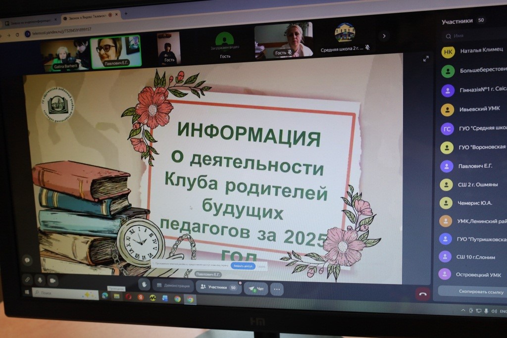 11.03.202611 марта 2026 года в Гродненском областном институте развития образования состоялось онлайн-заседание Совета областного клуба родителей будущих педагогов, на котором в 55 точках подключения присутствовало белее 90 участников. На заседании заместитель председателя областного Совета клуба Павлович Елена Геннадьевна, методист ГУ «Щучинский районный учебно-методический кабинет», проанализировала ключевые направления деятельности Совета клуба в 2025 году, определила задачи на предстоящий период.