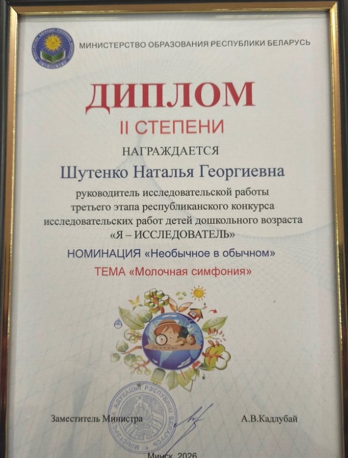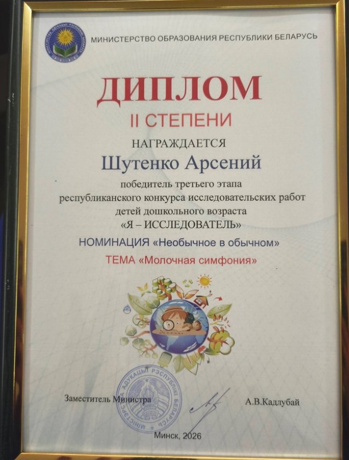 II степени – в номинации «Необычное в обычном» (исследовательская работа «Молочная симфония» Арсения Шутенко, воспитанника детского сада № 12 г. Новогрудка);