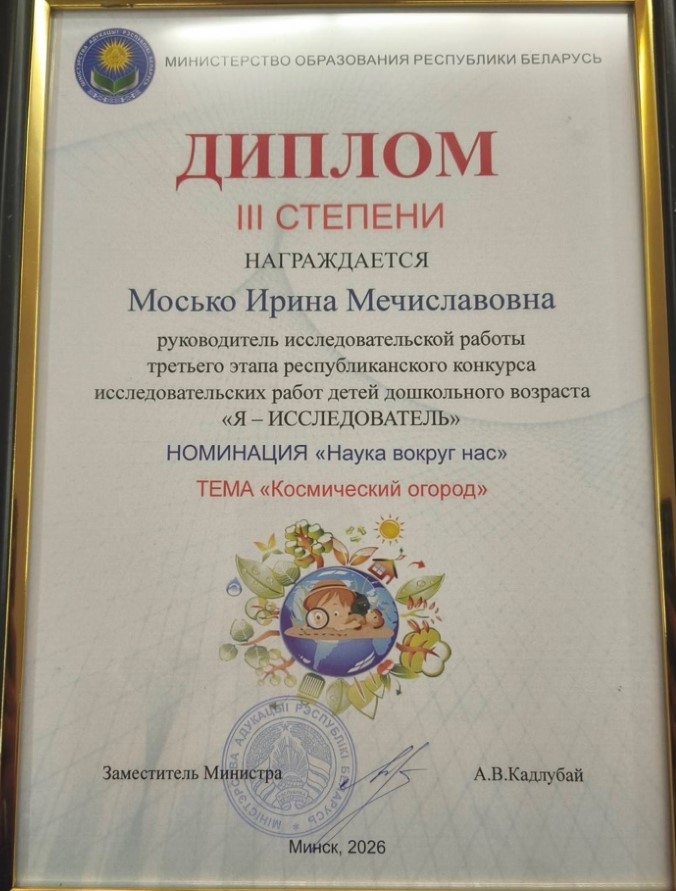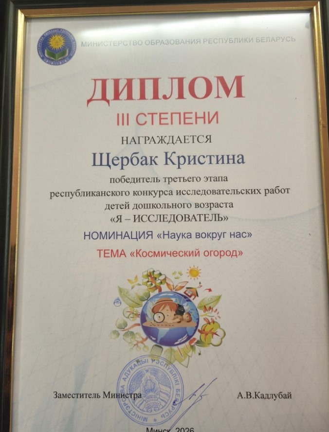 III степени – в номинации «Наука вокруг нас» (исследовательская работа «Космический огород» Кристины Щербак, воспитанницы детского сада агрогородка Индура).